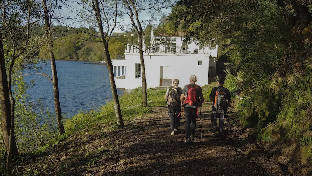 Un pouco antes de chegar ao balneario tomamos o desvio á dereita que nos introduce na senda que vai pegada río arriba. O estado actual do río non é o que sempre tivo, pois a construción do encoro de Frieira no 1970 augas abaixo, mudou o seu aspecto, creando unha paisaxe de beiras tranquilas e amplas masas de auga que asolagaron pesqueiras e vellos muíños. O que non variou foi o trazado da vía férrea que discorre pola outra beira, unindo Vigo con Ourense dende 1881.