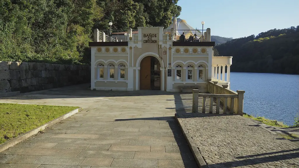 Continuamos pola beira do río ata o Balneario modernista de 1937, que se reflicte nítidamente nas súas augas. Cortegada é unha vila que ten sona polas súas augas curativas, de feito en tempos chamouse Cortegada de Baños. Un cartel infórmanos das súas propiedades, ricas en xofre e ferro, sendo recomendadas para enfermidades respiratorias, da pel, hepáticas…