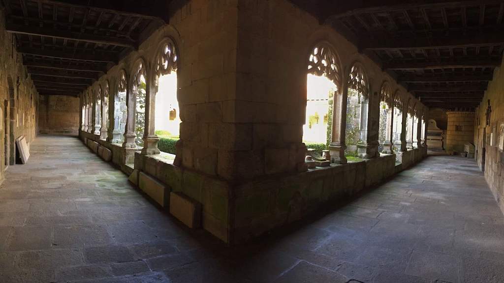 Iniciamos a visita polo claustro, construído a primeiros do s. XVI, Gótico-Renacentista, de amplas e fermosas proporcións, dun só corpo, con forma cadrada e teito de madeira, con arcos de medio punto cos tímpanos calados, apoiados en machóns cubertos de nervaduras. Nos muros interiores ten elementos do primitivo claustro románico. No interior do claustro, atópanse uns sarcófagos románicos dos fundadores do primitivo mosteiro, Aldara e Gonzalo Froila. Tamén foi empregado como cemiterio na segunda metade do S. XIX e comezo do XX, conservando aínda algunha lápida ao longo das súas paredes.