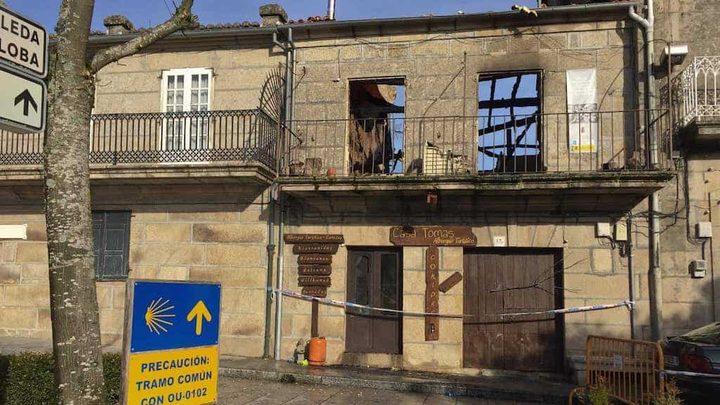 Coma sempre, antes de comezar a camiñar tivemos un momento para o café no mesmo Xunqueira (estupendo o que nos puxeron no Guede, con trozo de bica por un euro), e nos enterabamos da desagradable nova do incendio de Casa Tomás na pasada madrugada, un albergue de peregrinos de recente apertura que foi pasto do lume seica motivado por unha estufa de pellets, mentres viamos os labores de desentullo. Hai en todos os establecementos da vila carteis de apoio económico para a súa reconstrución, pois os donos residían no mesmo negocio, e quedáronse na rúa co posto. Unha mágoa que xente que aposta polo rural para vivir teña este revés!