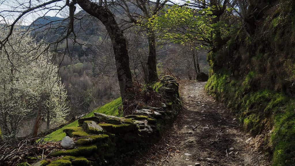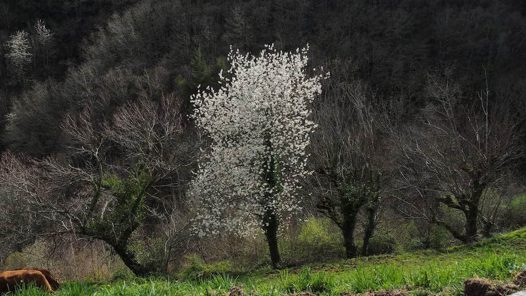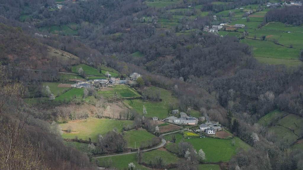 Sen pararnos moito, tomamos o camiño que nos leva, subindo, a Pedrafita do Caurel. Estamos indo pola vella vía de comunicación que unía Pedrafita con Seoane entre interminables soutos que son, sen dúbida, o outro punto clave da vexetación courelá. Malia súa proximidade aos núcleos de poboación, permanecen nun bo estado de conservación como consecuencia da súa utilización secular. Había tempo que non gozaba tanto dun camiño coma este. Que fermosura! Castiñeiros, prados, valados, sequeiros, a primavera comezando a notarse nas árbores floridas, sobre todo nas cerdeiras espalladas por todo o val… Esta organización espacial onde se combina riqueza natural e uso do territorio, xunto á beleza dos seus lugares e camiños, é o que confire á serra do Courel un valor extraordinario.
