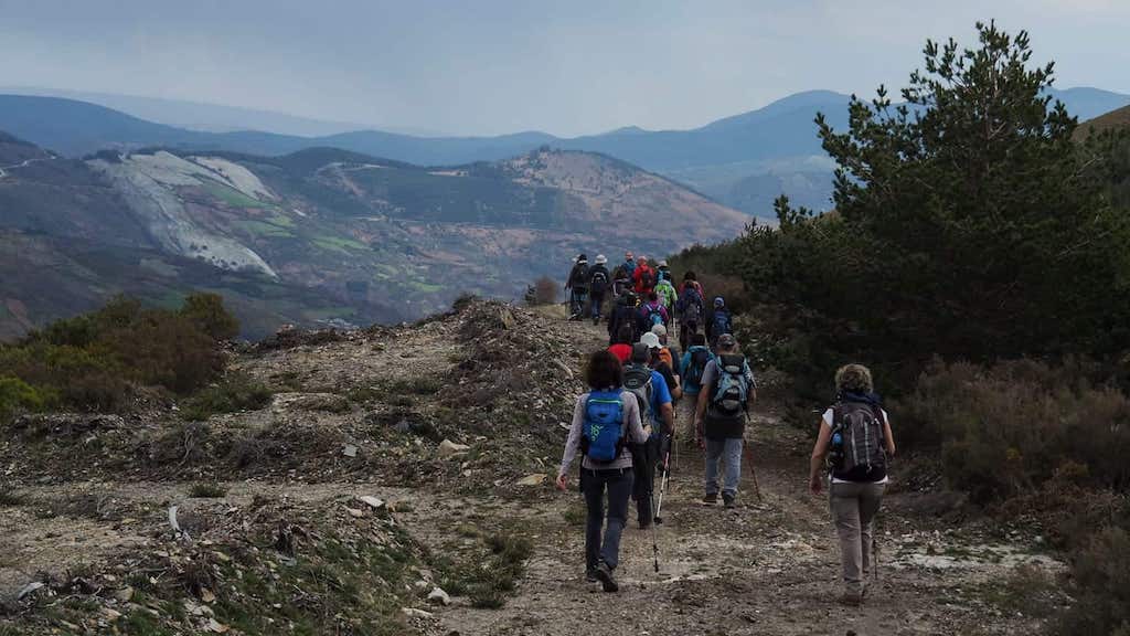 A parte dura da xornada comeza agora, cando deixamos a canteira ás nosas costas e vemos o longo e interminable cortalumes que temos por diante. Comezamos subindo sen tregua. E non é para menos. Temos que acadar o cumio da Escrita a 1455 m. Afortunadamente, o sol non xogou na nosa contra, pois tivemos sempre sobre nós unhas nubes de evolución que en calquera momento podían descargar, polo que tampouco era conveniente demorarse moito na subida. Mentres subimos polo cortalumes, e fago algunha parada para recuperar folgos, vexo prefectamente o trazado da ruta tamén por cortalumes cara ao Monte Oribio (que pouco me gusta andar por eles, e que dano ambiental e paisaxístico fan), que tivemos hai poucas xornadas.