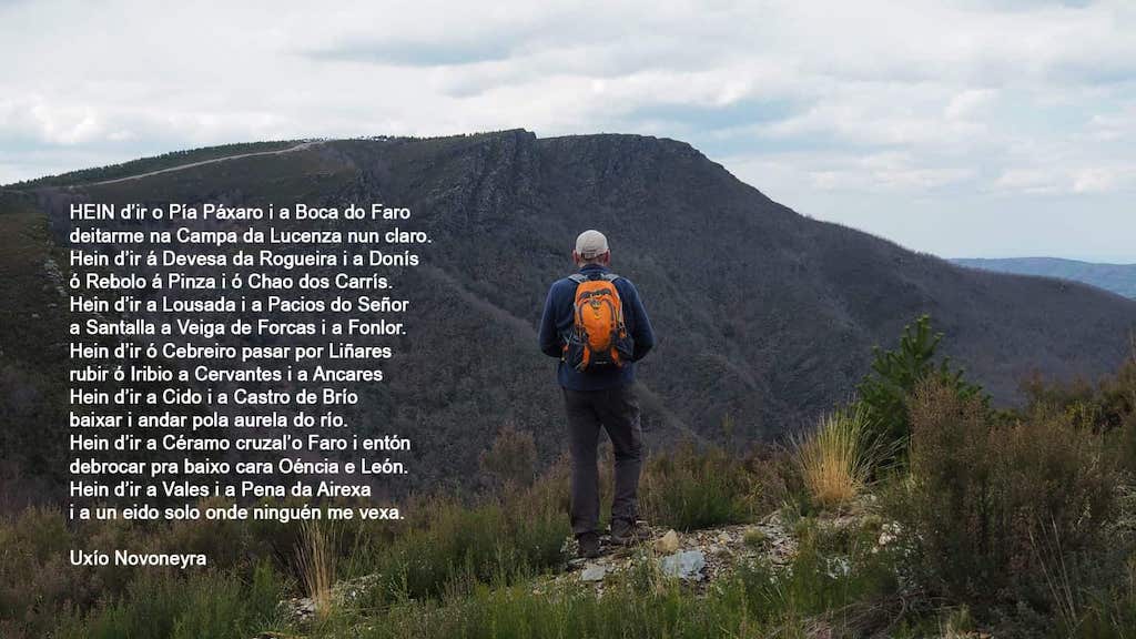 Pouco a pouco e sen deixar de botar a vista cara atrás de cando en vez para ver o espectáculo que temos ás nosas costas (e tamén o que levamos subido), chegamos ao cumio da Escrita. Ata agora temos un día estupendo para camiñar. Ceo azul con algunhas nubes altas e unha visibilidade incrible. Cambiamos de val e agora entramos no dominio do val do río Pequeno, un val que é un exemplo perfecto para apreciar o fortemente humanizado que está este territorio. Unha paisaxe constituída por un mosaico de pequenas aldeas, cultivos e bosques perfectamente ordenados desde os fondos do val -en xeral, moi escarpados- ás abas onde se instalan as aldeas, os cultivos e os soutos. En primeiro termo, o Alto da Pedra, Pedrafita do Courel, Paderne, lugares polos que camiñaremos de regreso a Requeixo, divisamos perfectamente a mancha grisácea do afloramento de rocha caliza no monte de Taro Branco entre Miraz e Vilasibil, ao lonxe o perfil da serra de Ancares, e tamén o perfil dos picos máis salientables do Courel, que temos a contraluz neste momento do día: Capeloso, Alto do Faro, Formigueiros, Teso das Papoulas (que nome tan fermoso), Pía Paxaro… Que razón tiña Neruda cando afirmaba que “se non escalas a montaña, xamáis poderás disfrutar a paisaxe”. Que fermosura!
