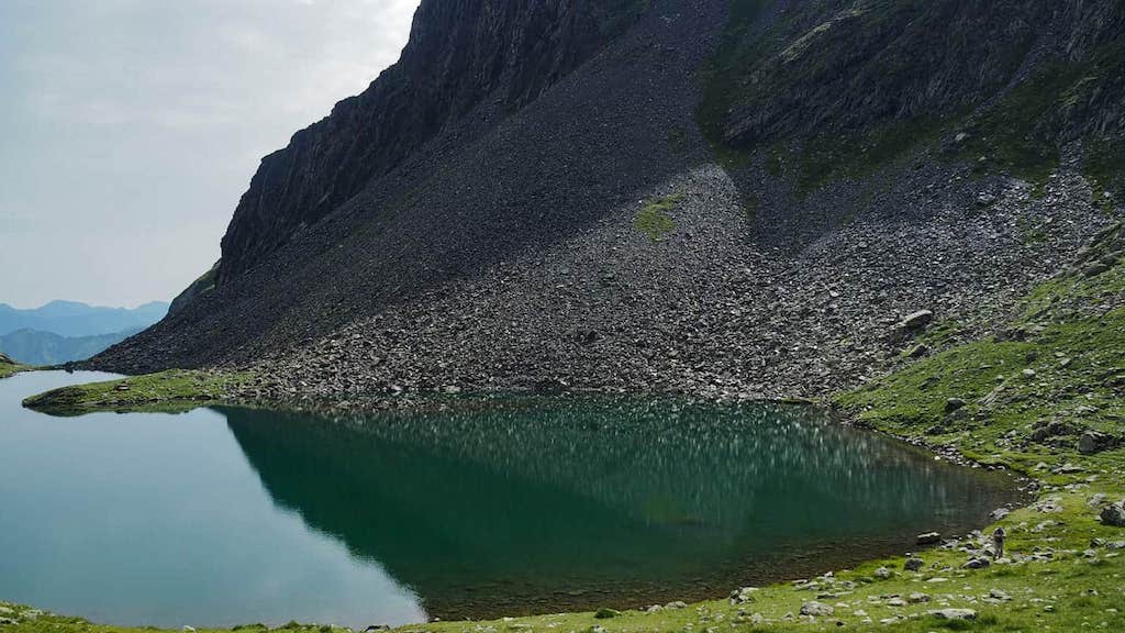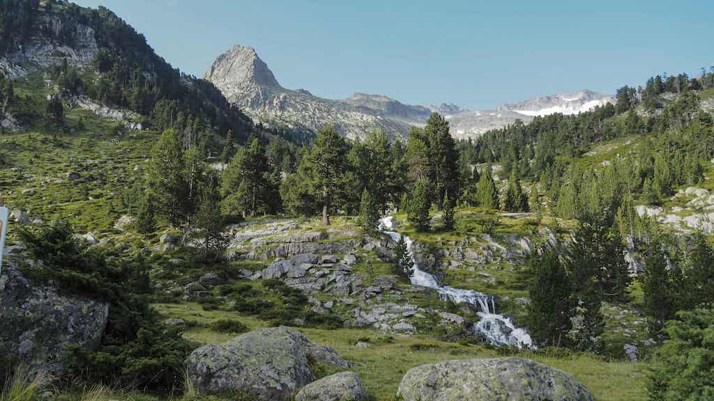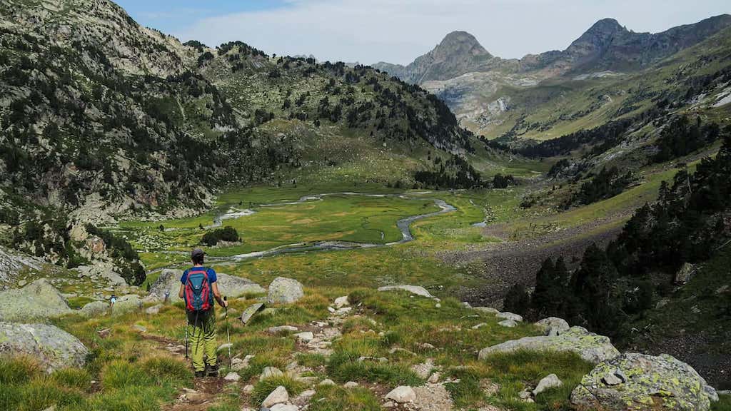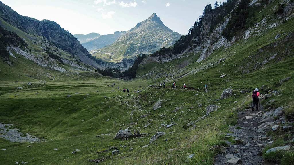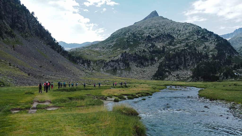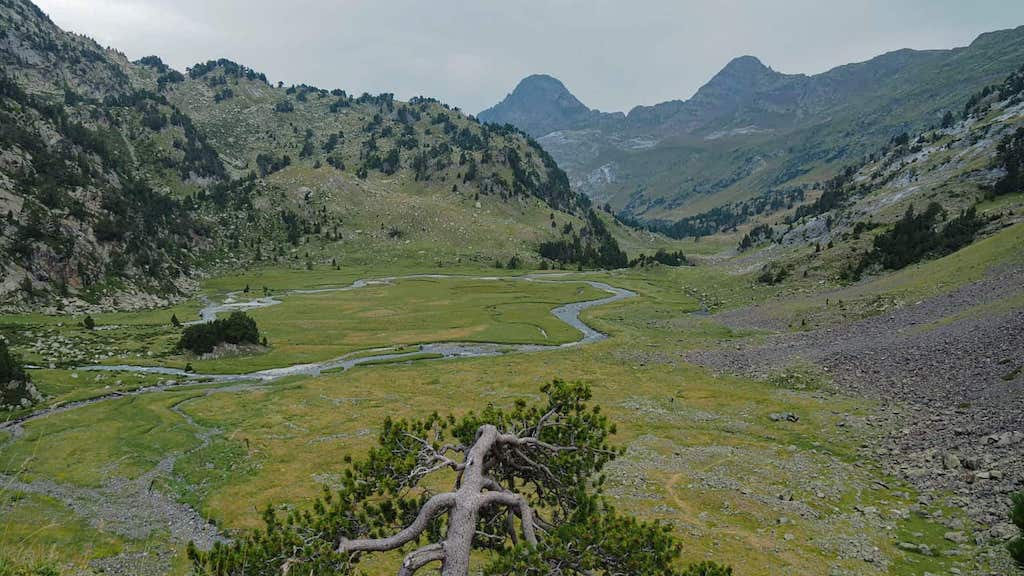 Superada unha rupestre cabana, seguimos ascendendo mediante algúns zig-zags por terreo algo pedregoso que nos sitúa nun colado que da paso a un bonito e verde val, co chamativo Pico de Aigualluts, como telón de fondo.