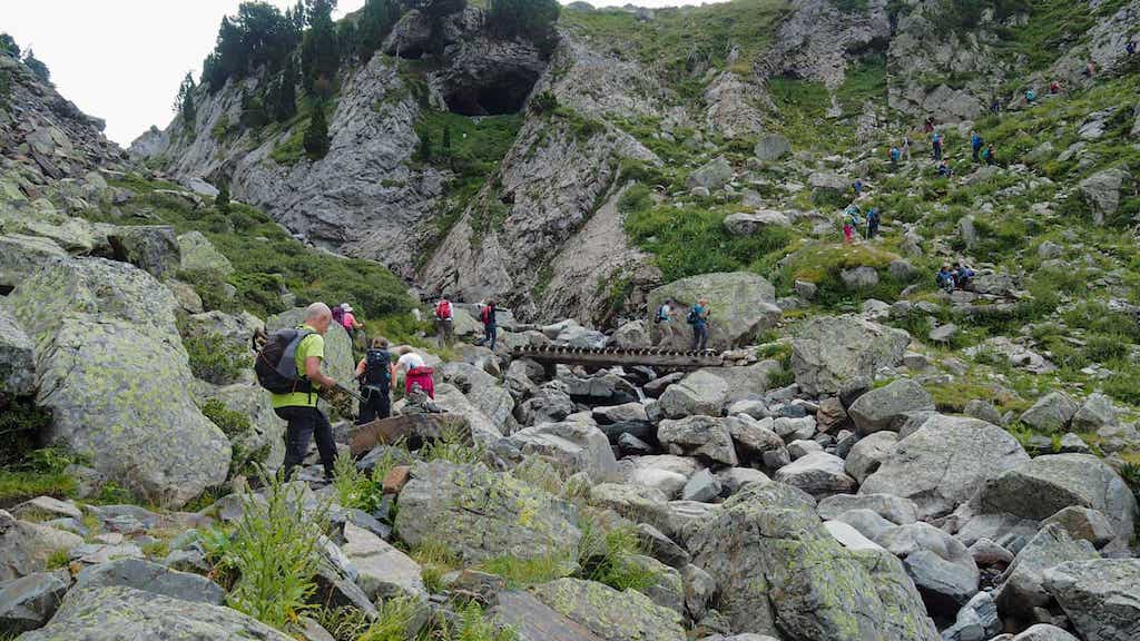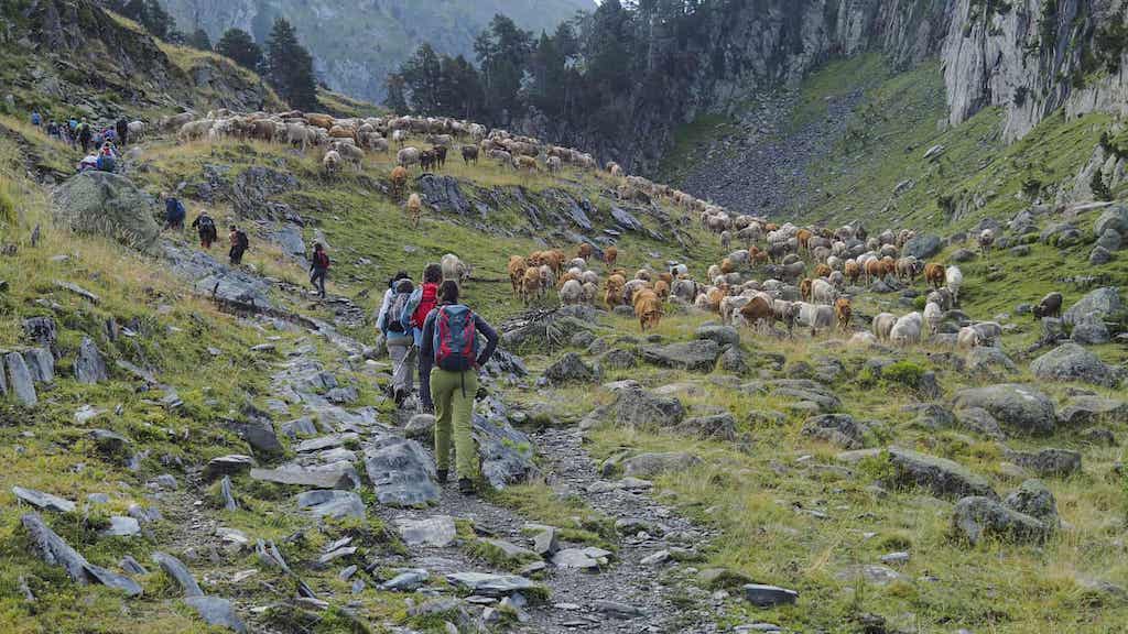 Logo de reunirnos e prepararnos para a marcha, e unha vez cruzada a pequena ponte de madeira sobre o torrente que baixa dos Ibones de Villamuerta, continuamos pola pista ata chegar en poucos metros ao cruzamento de camiños cara ao refuxio de La Renclusa ou a Aiguallut. A partir de aquí comeza un tramo no que imos salvar a maior parte do desnivel destes primeiros quilómetros da andaina ata chegar a unha gran pradaría. Nestes primeiros pasos imos por un sendeiro bastante ben definido con algúns tramos nos que as propias pedras parecen as baldosas dun paseo pero, xusto cando acometemos a subida con máis desnivel a salvar, tratando de evitar as pedreiras que hai polo camiño, atopámonos cunha manda de vacas que baixan cara a nós e que imos sorteando como podemos. Salvamos polos pelos de non quedar bloqueados!
