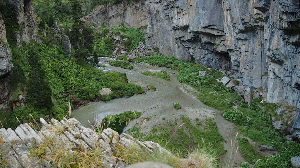 Seguimos adiante atravesando o val cuberto de pasteiro, ata chegar a un valo de madeira que serve como miradoiro sobre a dolina onde conflúen as augas do glaciar do Aneto, o Forau de Aigualluts. Un capricho da natureza sen igual, un lugar máxico polo que as augas descendentes dos glaciares desaparecen misteriosamente baixo a terra para reapareceren nin máis nin menos que no Val de Arán. Seica no 1931 o espeleólogo Norbert Casteret aclarou este misterio botando catro barrís de fluoresceína polo Forau e horas máis tarde comezou a brotar auga cor verde intensa polos Uelhs deth Joeu (ollos do xudeu) no Val de Arán, e por esta singularidade xeolóxica, as augas que debían verter no río Ésera fano na conca do Garona que desemboca no Atlántico.
