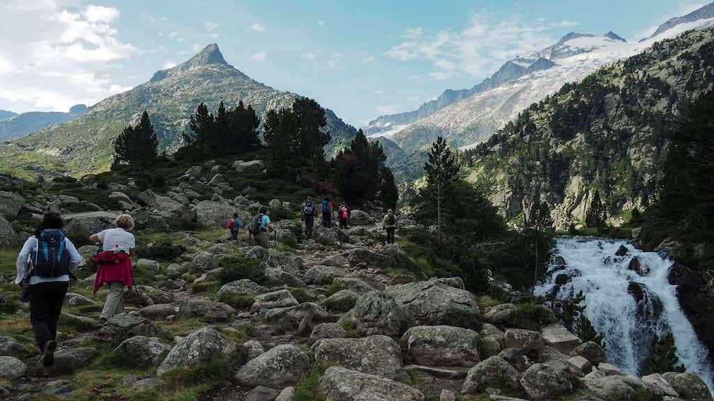 Tras observar este fenómeno kárstico, continuamos adiante bordeando pola nosa dereita a mencionada dolina e en suave ascenso alcanzamos enseguida a bulliciosa Fervenza de Aigualluts. A imaxe non pode ser máis abraiante: a caída da fervenza coa Tuca de Aiguallut á súa esquerda e a primeira visión do glaciar e pico Aneto ao fondo, que cos seus 3404 m de altitude é o máis alto dos Pireneos.