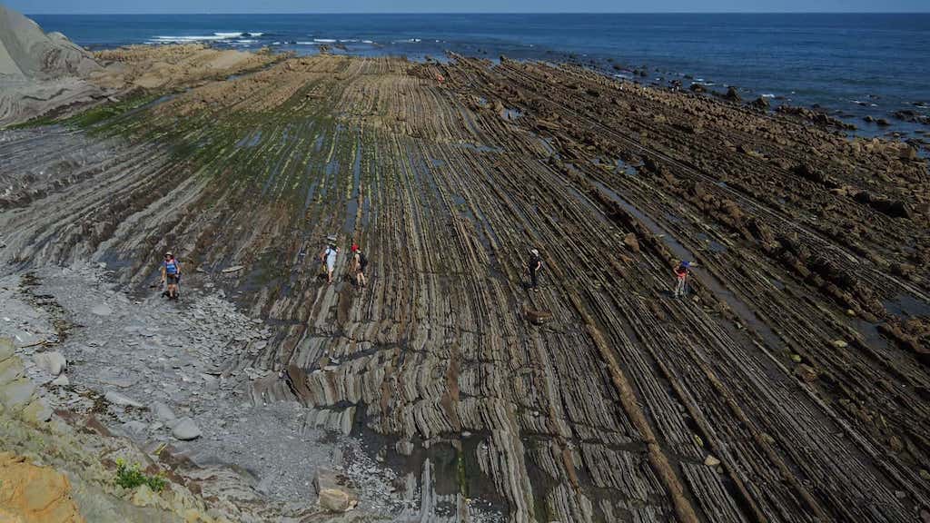 Deixamos a atalaia da igrexa e avanzamos ata un pequeno mirador sobre o cantil. Estamos diante da pequena cala de Algorri, onde se identificou unha fina capa negra que sinala a gran catástrofe cando se extinguiu máis do 70% das especies do planeta. Esta gran extinción semella estar relacionada co impacto dun gran meteorito na península de Yucatán. Coa marea baixa, podemos ver a rasa mareal que se estende e penetra no mar centos de metros, anque en total, esta de Zumaia chega a acadar os 5 km de extensión, o que a converte, segundo os expertos, na maior de toda Europa. O lugar impresiona pois temos diante todo o percorrido que imos facer por esta costa tan escarpada. Unha paisaxe tan espectacular e fermosa non podemos deixala sen facernos unha foto de grupo, e este é un lugar inmellorable!